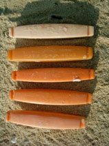 企業などもわります。 (中)ガラス浮き。最近ではプラスティック製浮きに取って変わられ ているだけに希少性もあります。 (右)人工物の浮きも、こうして見るとカエルみたい。 |
