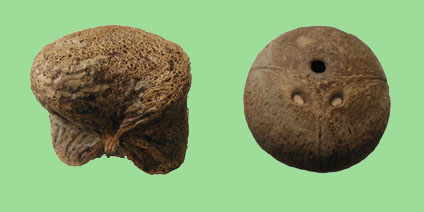 重さはわずか30グラム弱。実は密に詰まった繊維質でできています。 (右)写真はヤシの実(ココヤシ)の内果です。皮は厚くて硬い木質で、こ の上をさらに厚い繊維質の果皮が包んでいます。硬い内果皮には芽と根の 出る穴が開いています。(2つの実は実際の大きさ比率ではありません) |